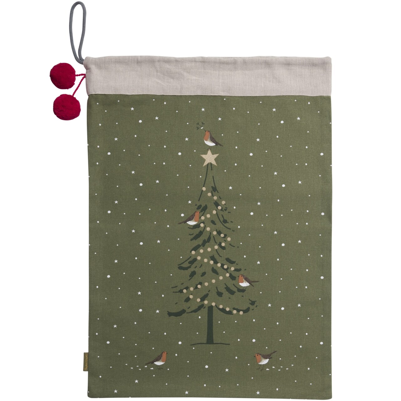 Der aparte Weihnachtssack aus 100% Baumwolle ist mit Sophies entzückenden, rundlichen Rotkelchen verziert. Sie sitzen auf einem beleuchteten Weihnachtsbaum vor einem schneebeckten olivgrünen Hintergrund und ruhen sich aus. Das Rotkelchen oben auf der Spitze trägt einen Mistelzweig im Schnabel.