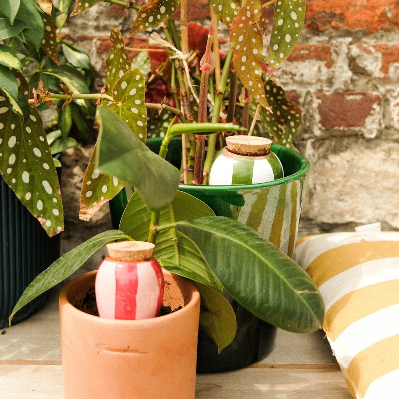 Box mit 3 Mini-Ollas | 2 x gestreift - grün-weiß und rot-rosa und 1 x Terracotta | Drei Pflanzen-Sitter für die optimale und autonome Bewässerung von Topfpflanzen, perfekt geeignet für kleine bis mittelgroße Pflanzen in Töpfen mit weniger als 15 cm Durchmesser.