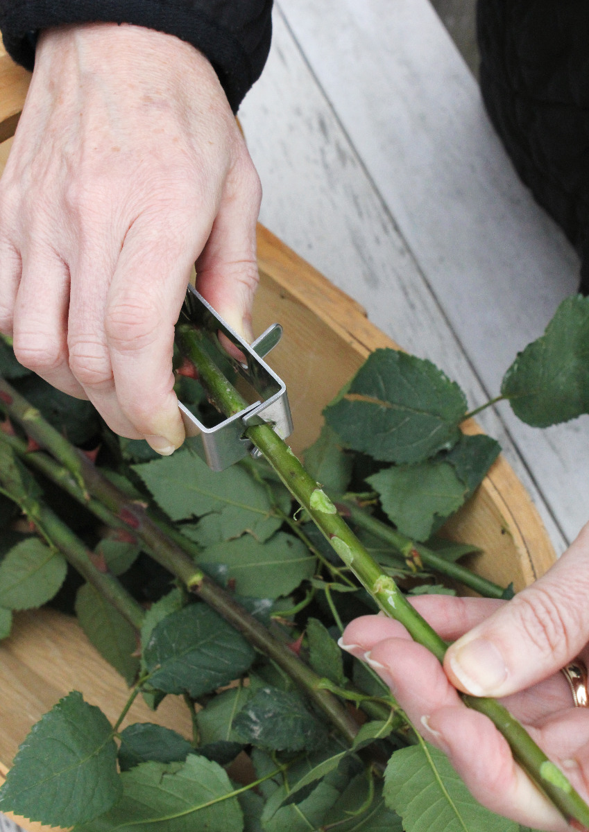 Einfach am Rosenstiel entlangziehen, schon werden Dornen und Blätter abgestreift.