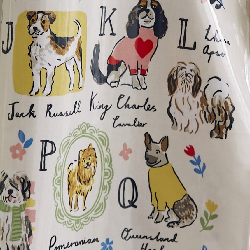 Das Design: Mit Gouache- und Aquarellfarben handgemalte Hunde-Supermodels, die sich von ihrer besten Seite zeigen - bunt präsentiert in einer Art Sammelbuch-Look, der durch Kritzeleien und Bordüren unterstrichen wird. Buttergelbe Ränder und Bindebänder setzen hübsche Akzente und lockern das Design auf. Die verschiedenen Hunderassen sind in alphabetischer Reihenfolge auf der Schürze verteilt, wobei jeder Buchstabe eine andere Hunderasse repräsentiert - von A wie Afghane über N für Neufundländer bis hin zu Z für Zuchon.