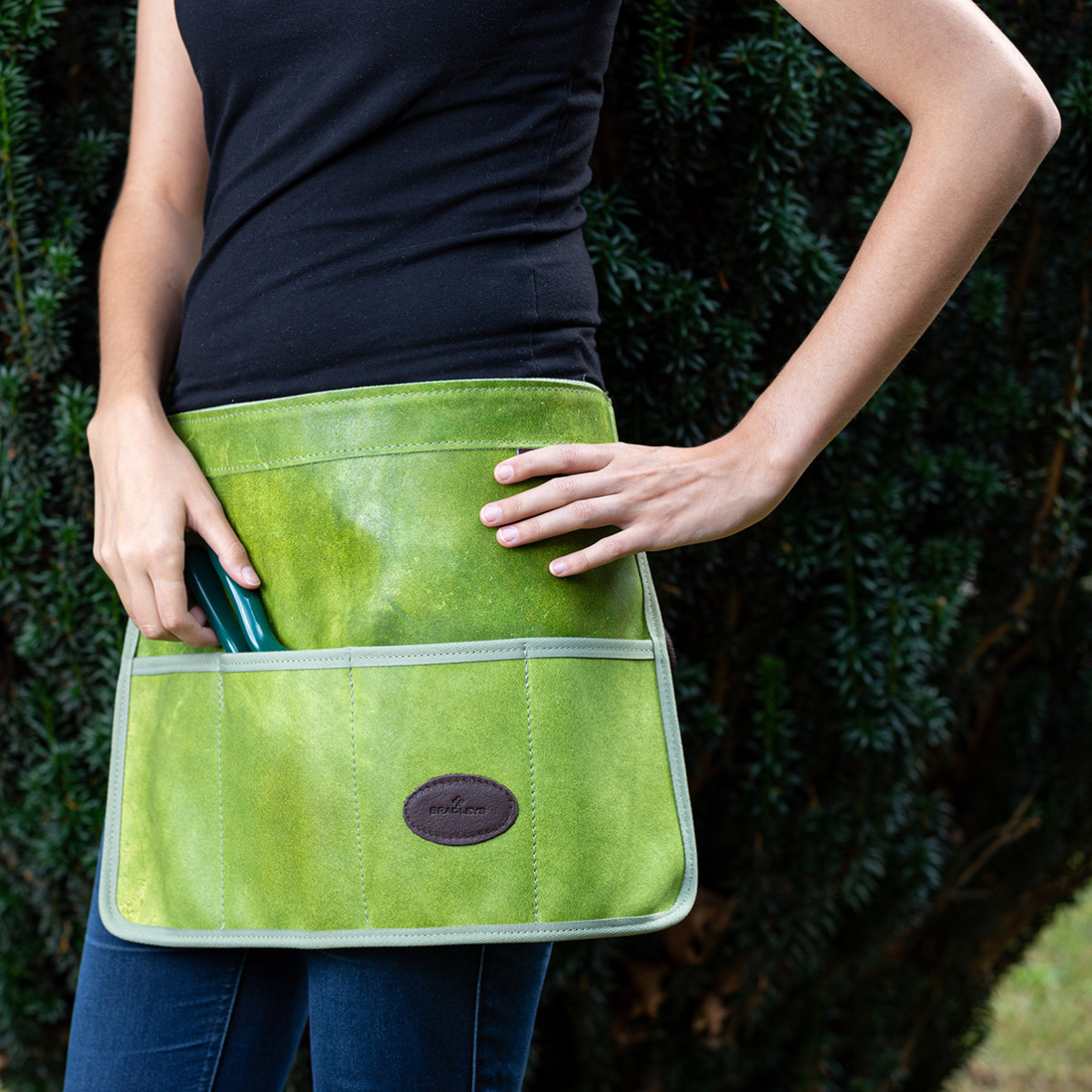 Aus englischem Glattleder - grasgrün, statement-pink oder schokoladen-dunkel - mit vier Taschen für Gartenschere, Handwerkzeuge, Handy ...