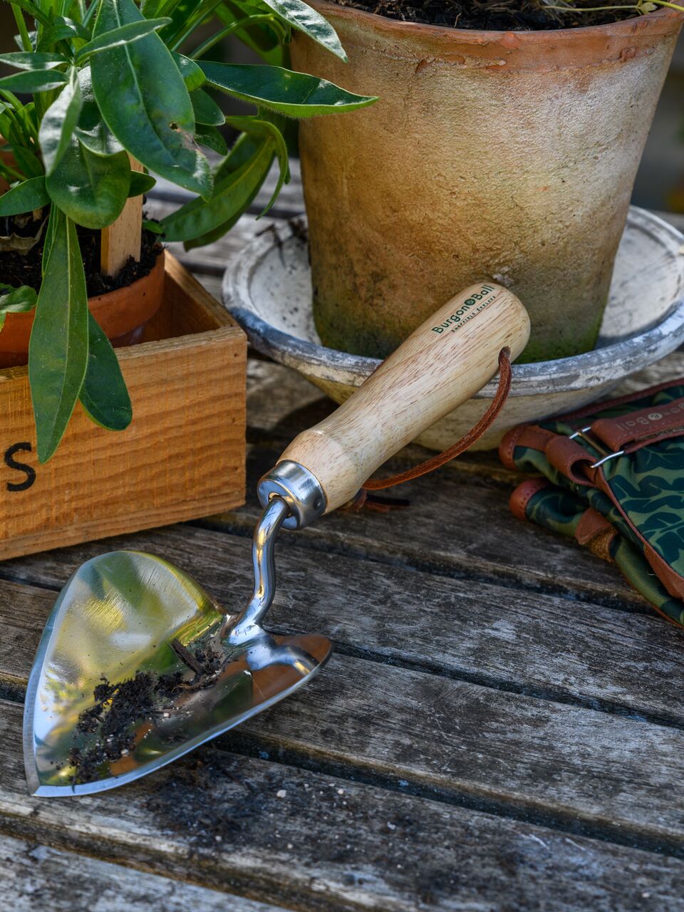 • Der FSC-zertifizierte Hartholzgriff (Esche) gibt angenehmen Halt; an der Aufhängekordel aus Leder kann die Pflanzschaufel ordentlich aufgehängt werden.