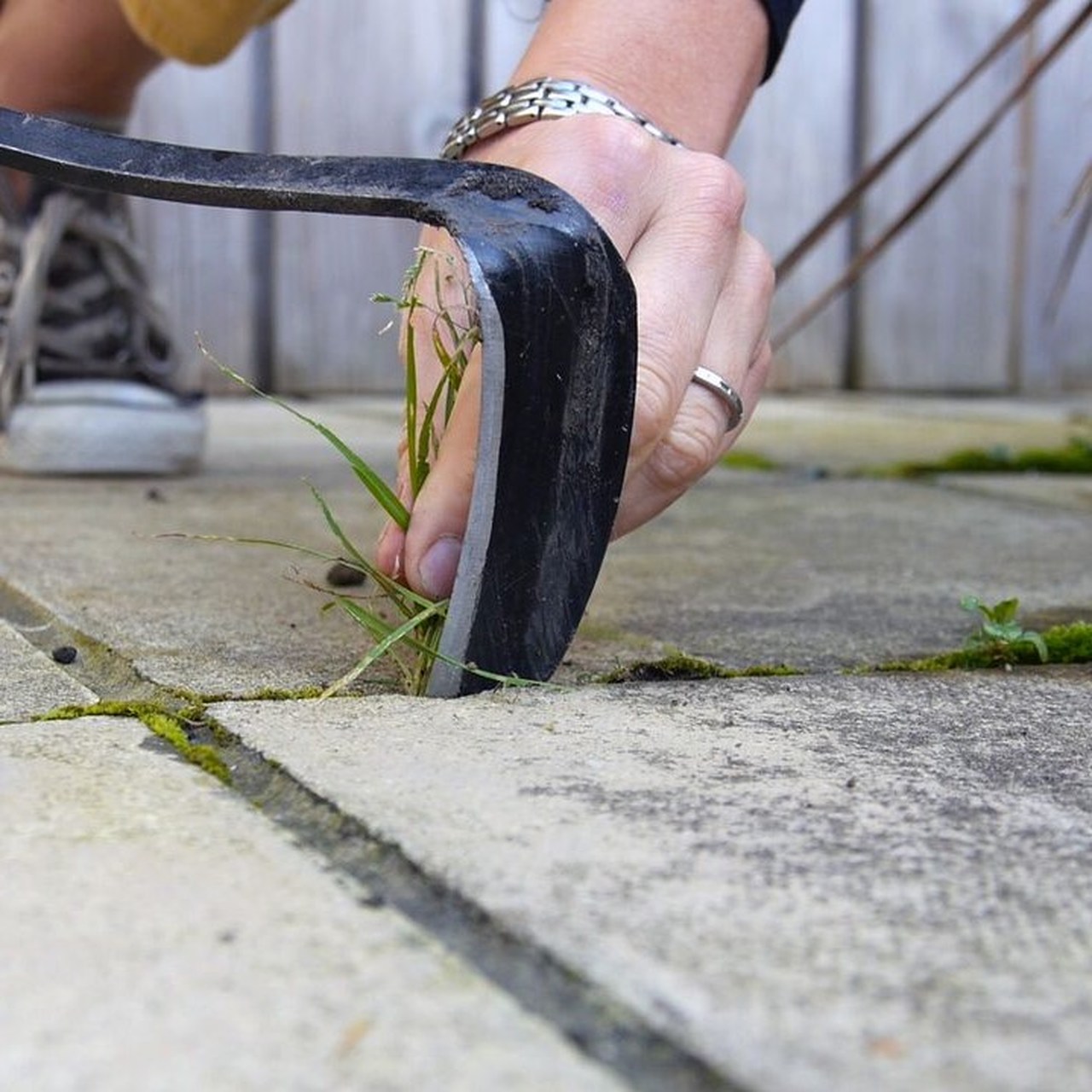 Die elegant gebogene, scharfe Klinge wird zum Körper hergezogen, gleitet leicht unter die Oberfläche und entfernt das 'ungeliebte' Grün. Mit der Spitze können hartnäckige Wurzeln zerhackt und abgeräumt werden.