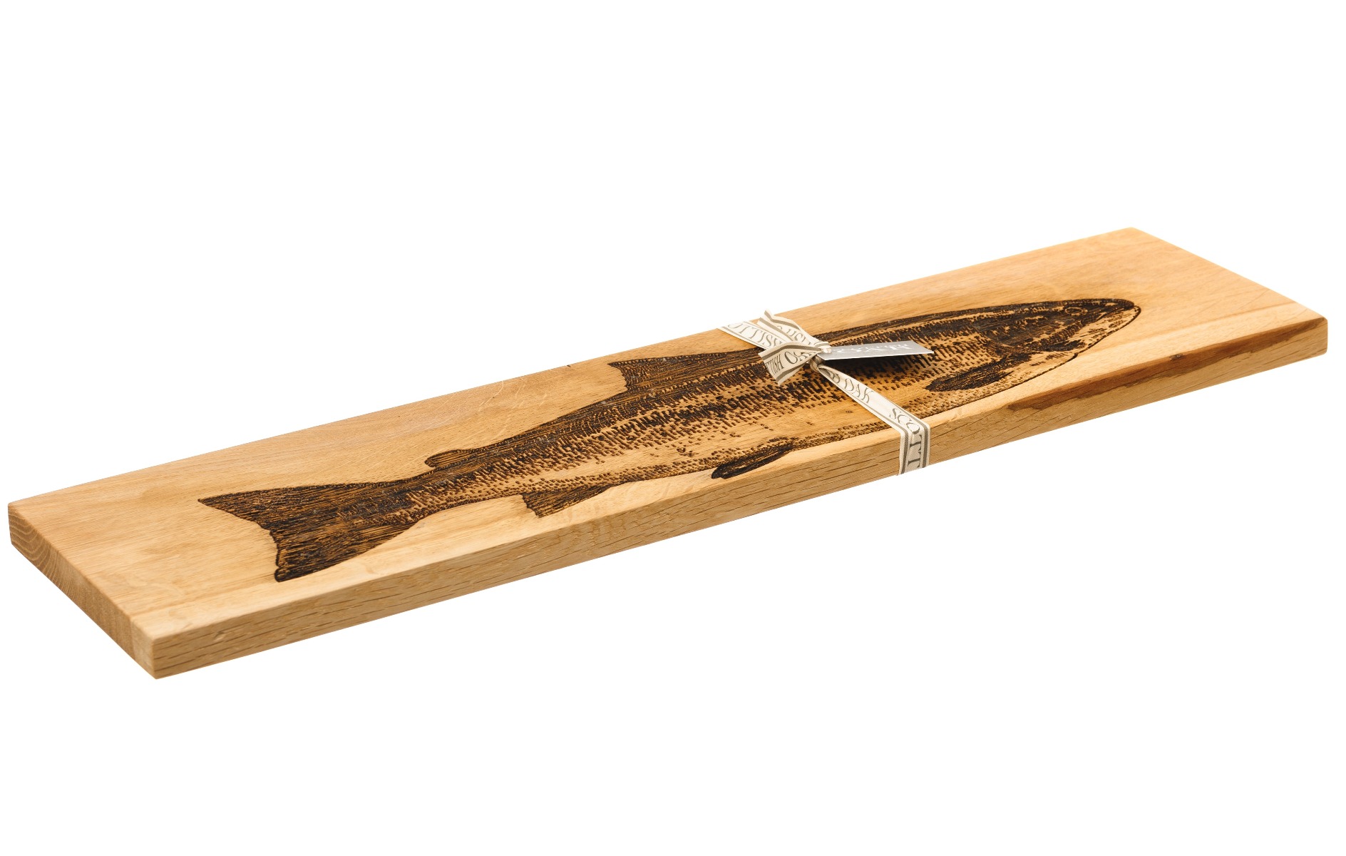 Schottlands beliebtester Fisch - der Lachs - handillustriert und -graviert auf einem großen, länglichen Servierbrett aus Schottischer Eiche. Die auffällige Gravur macht das Lachs-Servierbrett einzigartig und zu einem Must-Have für begeisterte  Fischliebhaber, Fischfreundinnen oder Angler.