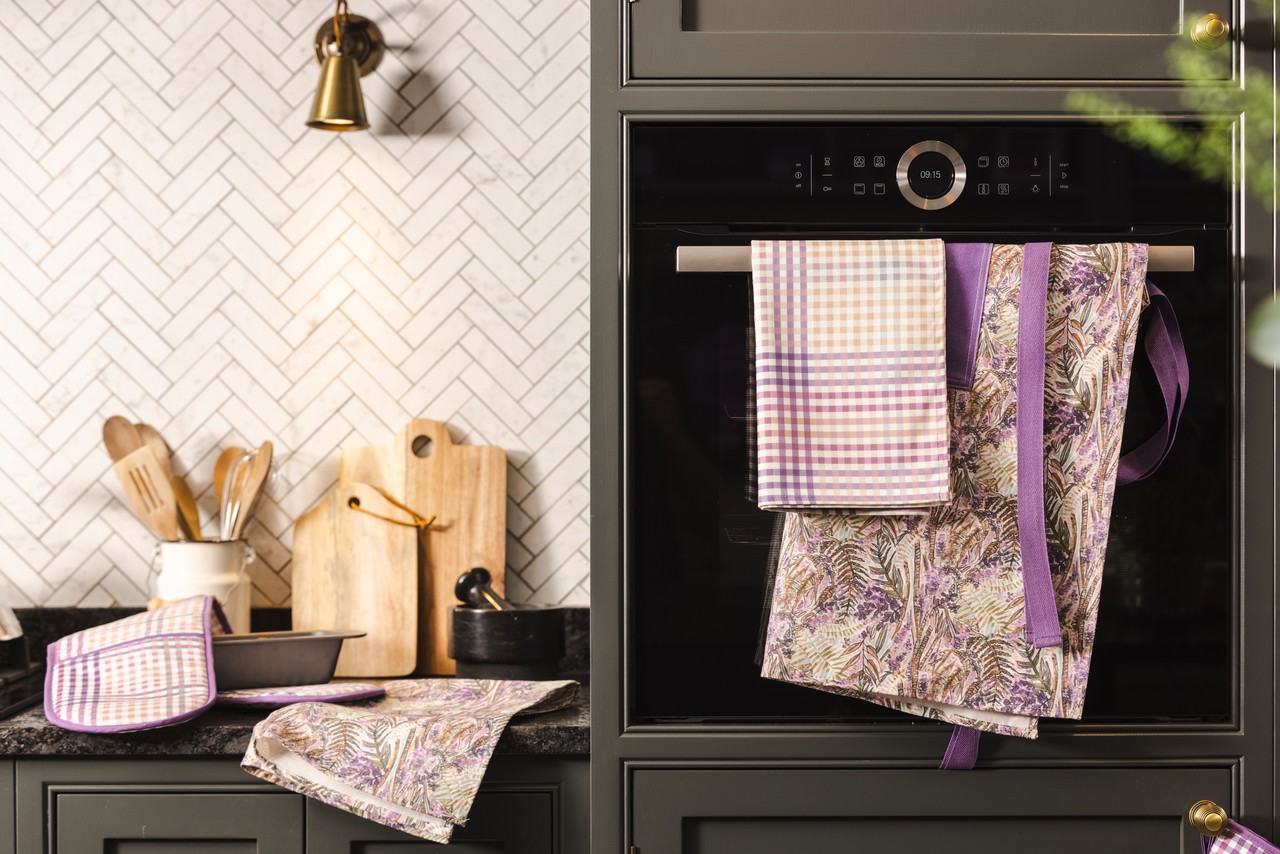 Die Backofen-, Topf- und Ofenhandschuhe aus der Heide-Serie zeigen zwar nicht die wunderschönen Zeichnungen, sind aber in Design und Farbe so gehalten, dass sie die Schürze und das Geschirrtuch perfekt ergänzen.