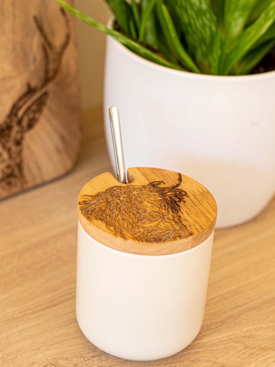 Schottisch inspiriertes Marmeladen-Set aus Keramik und Eiche | Motiv Highland Cow | Gemütlicher Country-Chic für Küche und Tisch