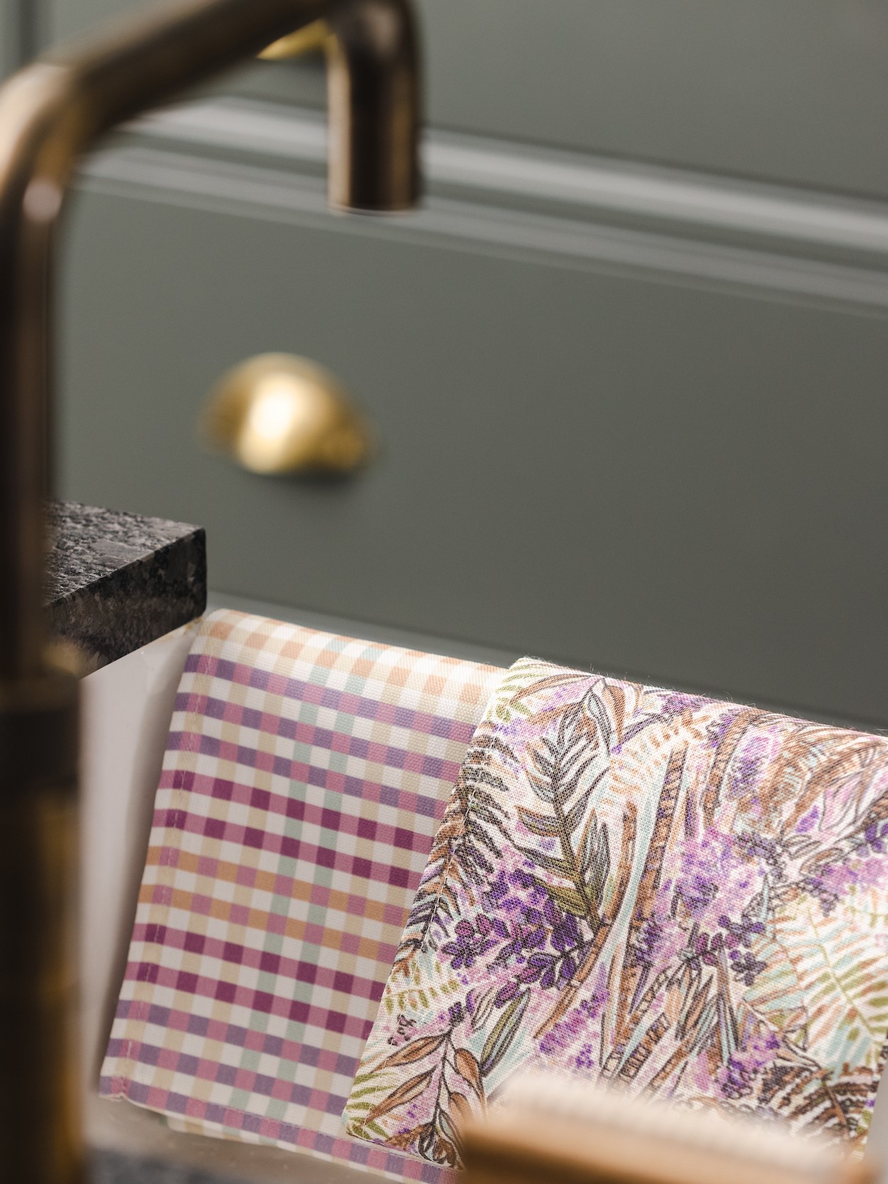 Für die Geschirrtücher - hier: Gebirgsheide - wurde ein Gewebe aus recycelter Baumwolle und recyceltem Polyester in einer 80/20 Mischung entwickelt. Hergestellt werden die neuen Produkte in Großbritannien.