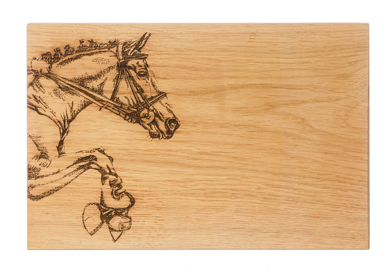 Rustikales Schneide- oder Servierbrett für Pferdefreunde - handillustriert und graviert in rustikaler Schottischer Eiche - ebenso praktisch, wie dekorativ.