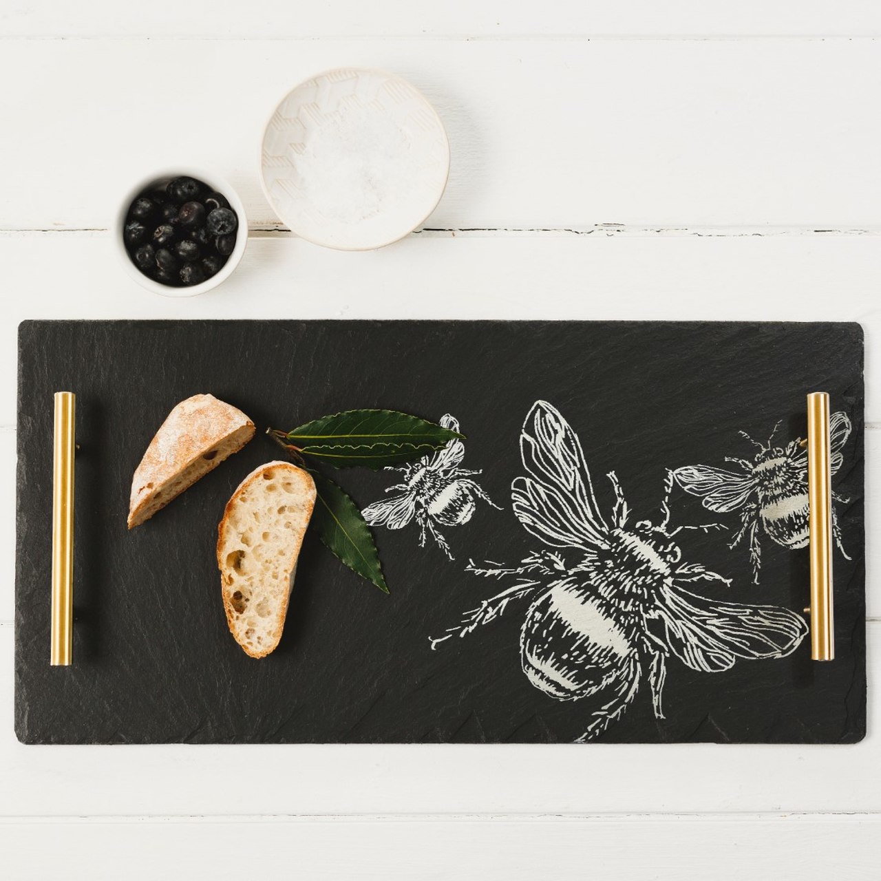 Mit vergoldeten Edelstahlgriffen, die einen edlen Akzent auf den dunklen Schiefer setzen und das Bienen-Trio für einen festlichen Auftritt adeln.