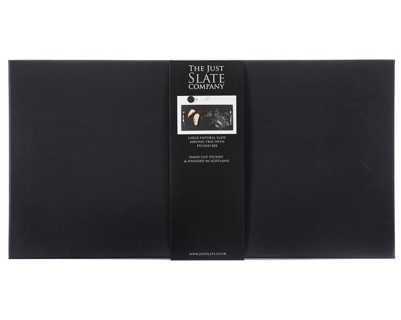 Dieses große Bienen-Schiefer-Serviertablett wird in der edlen The Just Slate Company - Präsentbox geliefert. In der stabilen Box kann das Serviertablett - bis zum nächsten Einsatz - bequem verstaut und aufbewahrt werden.