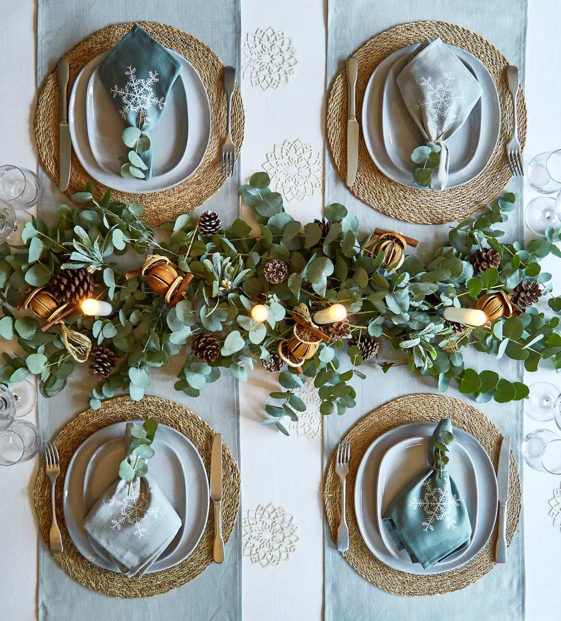 Zarte Schneeflocken mit einem Hauch magischen Frosts in Weiß, Silber-Grün oder Aqua-Grün, die gemischt oder kombiniert werden können, um eine bezaubernde, winter-weihnachtliche Tischatmosphäre zu kreieren.