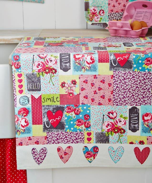Vintage im Patchwork-Design, warmes Rosa, Rot und Hellblau in Verbindung mit Blüten und Herzen, untenrum noch eine rote Zick-Zack-Borte (über den 5 Herzen, auf dem Bild nicht zu sehen).