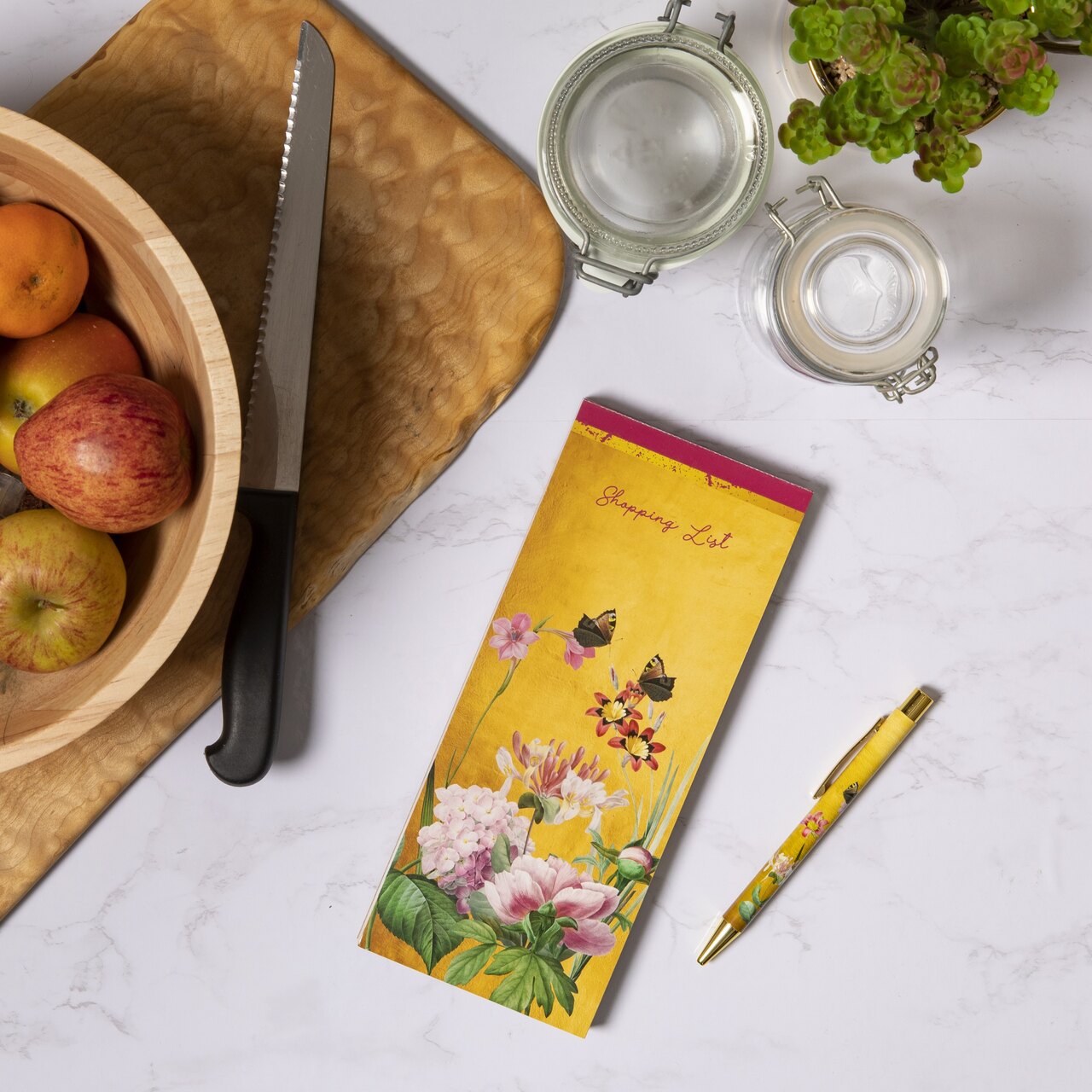 Der Block mit den hübschen Einkaufslisten kann einfach auf dem Küchenregal bereitgehalten oder aber dekorativ an den Kühlschrank 'geheftet' werden; auf der Rückseite sind zwei starke Magnete angebracht, die ihn sicher an Ort und Stelle halten.
