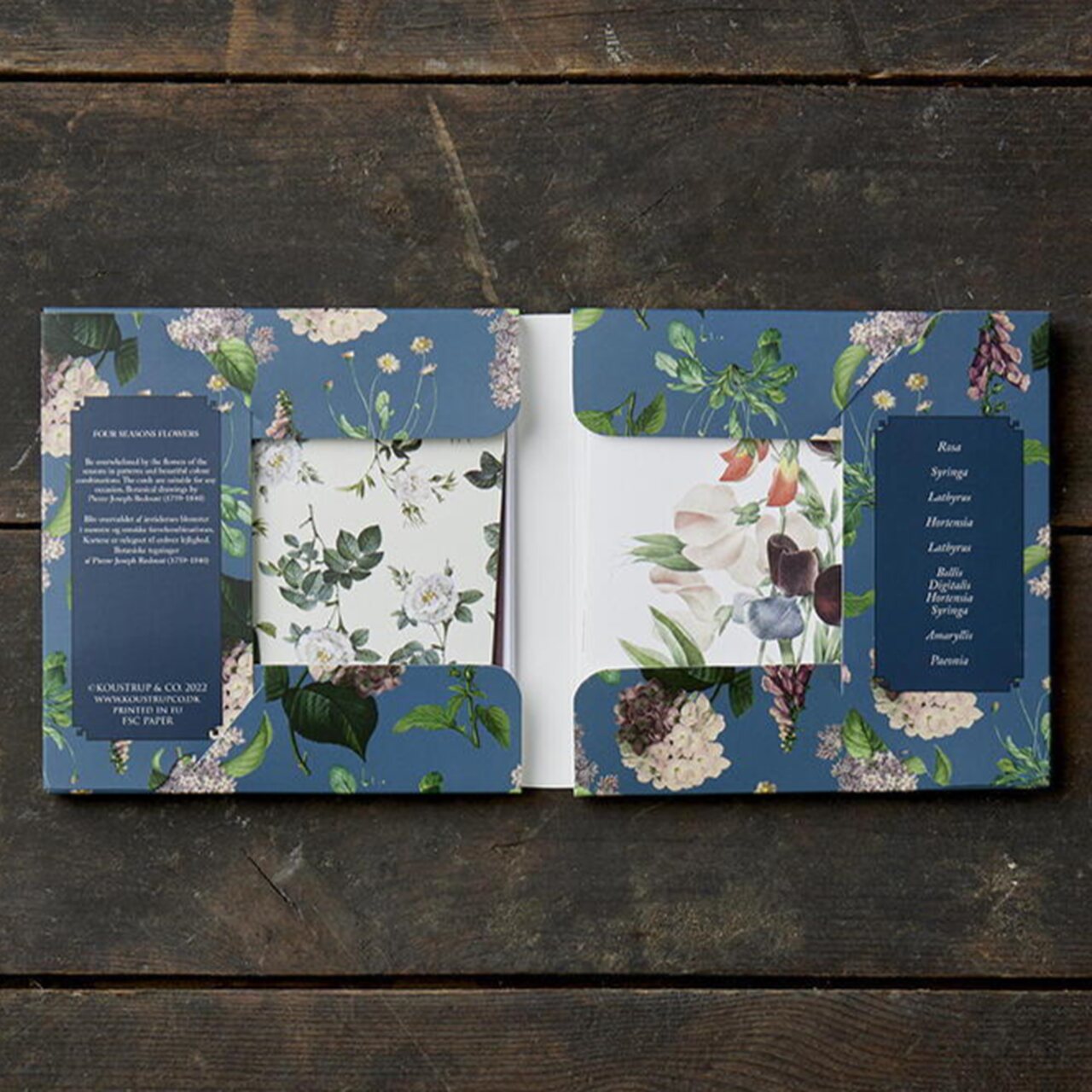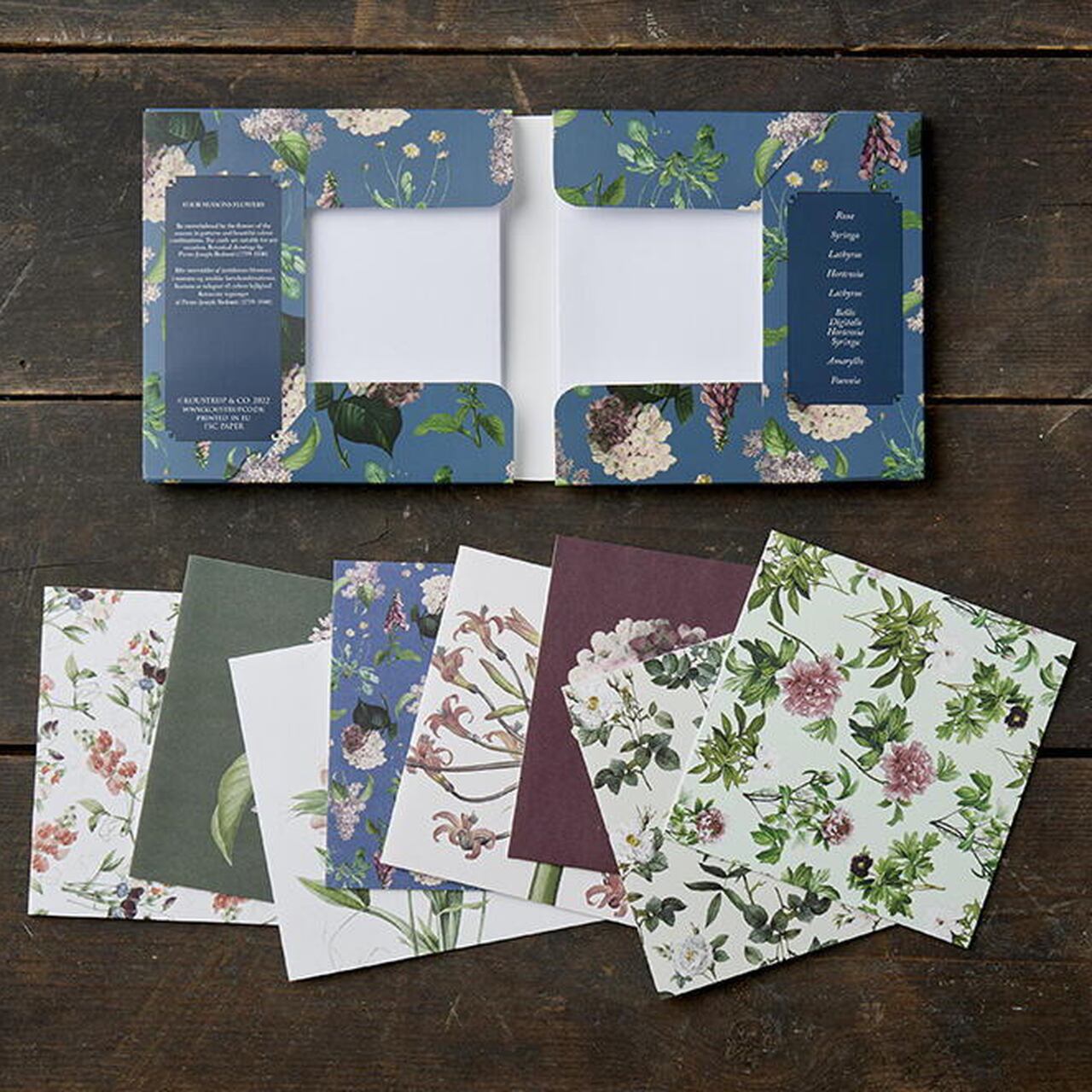 Die quadratische Kartenmappe enthält acht Doppelkarten (ca. 13 x 13 cm - zugeklappt) mit bezaubernden Blumenillustrationen, die die vier Jahreszeiten repräsentieren; entsprechende Umschläge aus Eukalyptuspapier sind ebenfalls beigefügt. Für die Grußkarten wurden Entwürfe von Rosen, Flieder, Hortensien, Pfingstrosen, Erbsenblüten und Amaryllis ausgewählt.