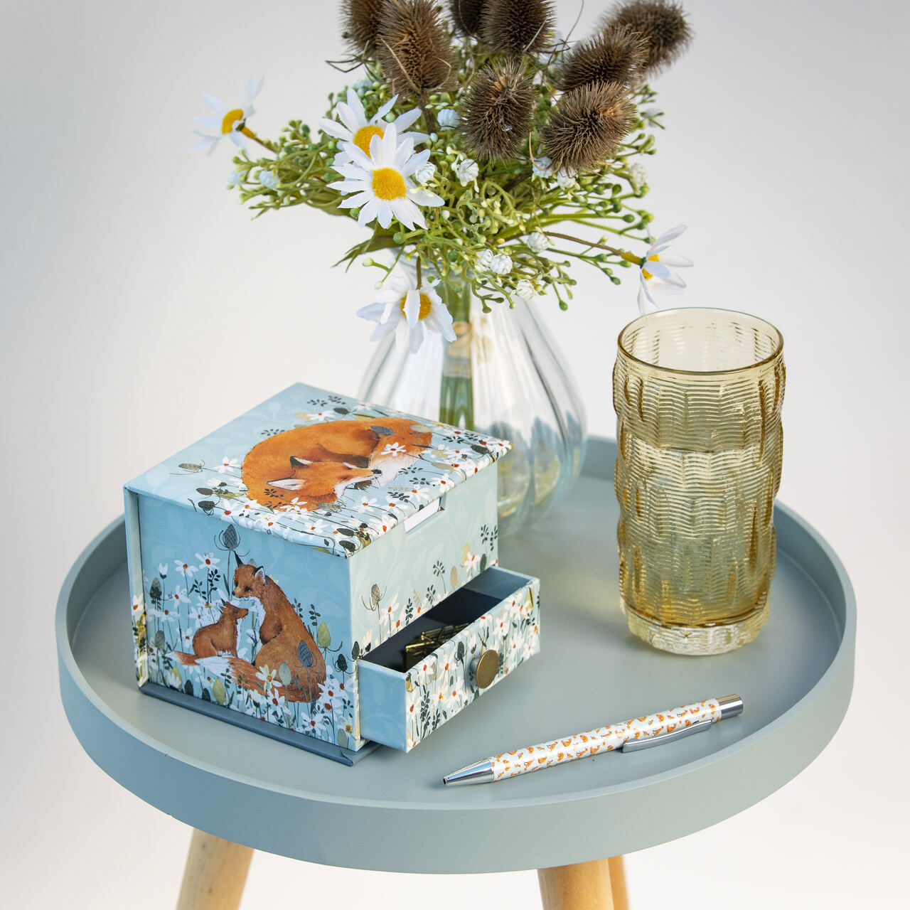 Liebevoll illustrierte Zettelbox mit Füchsen auf der Blumenwiese | Lassen Sie sich von der... mehr