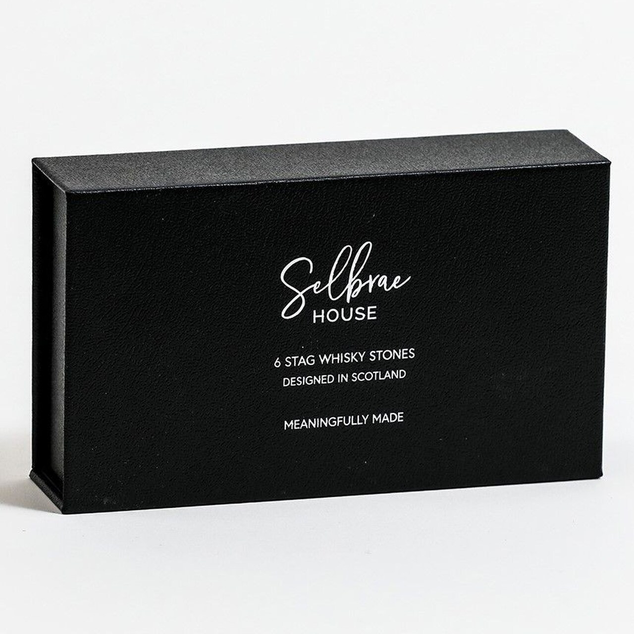 Das Set - bestehend aus 6 Whisky Stones mit Hirsch-Gravur - wird, zusammen mit einem Aufbewahrungsbeutel aus Samt, in der edlen 'The Just Slate Company' - Geschenkbox geliefert.