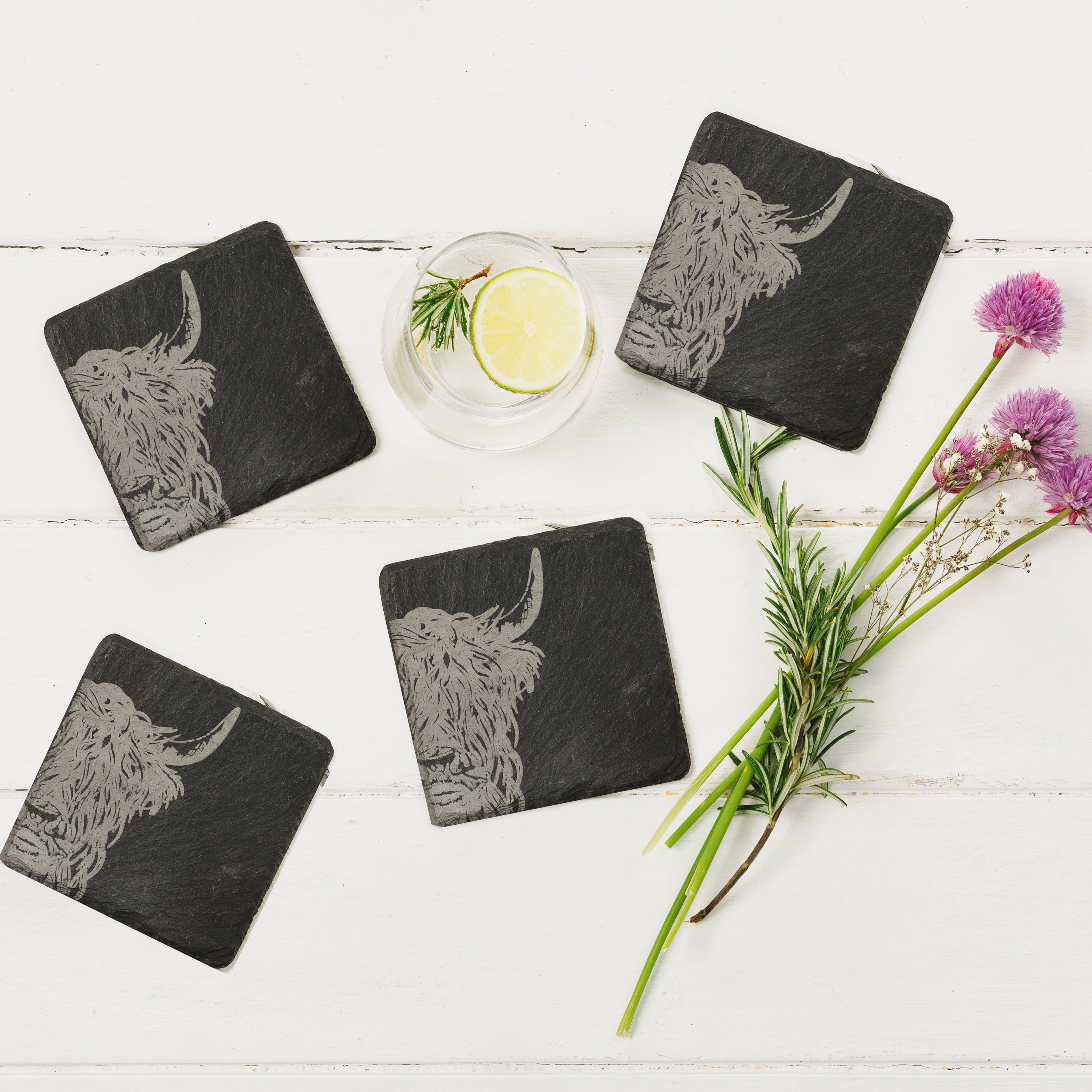 Highland Cow | Glasuntersetzer aus Schiefer, 4er-Set