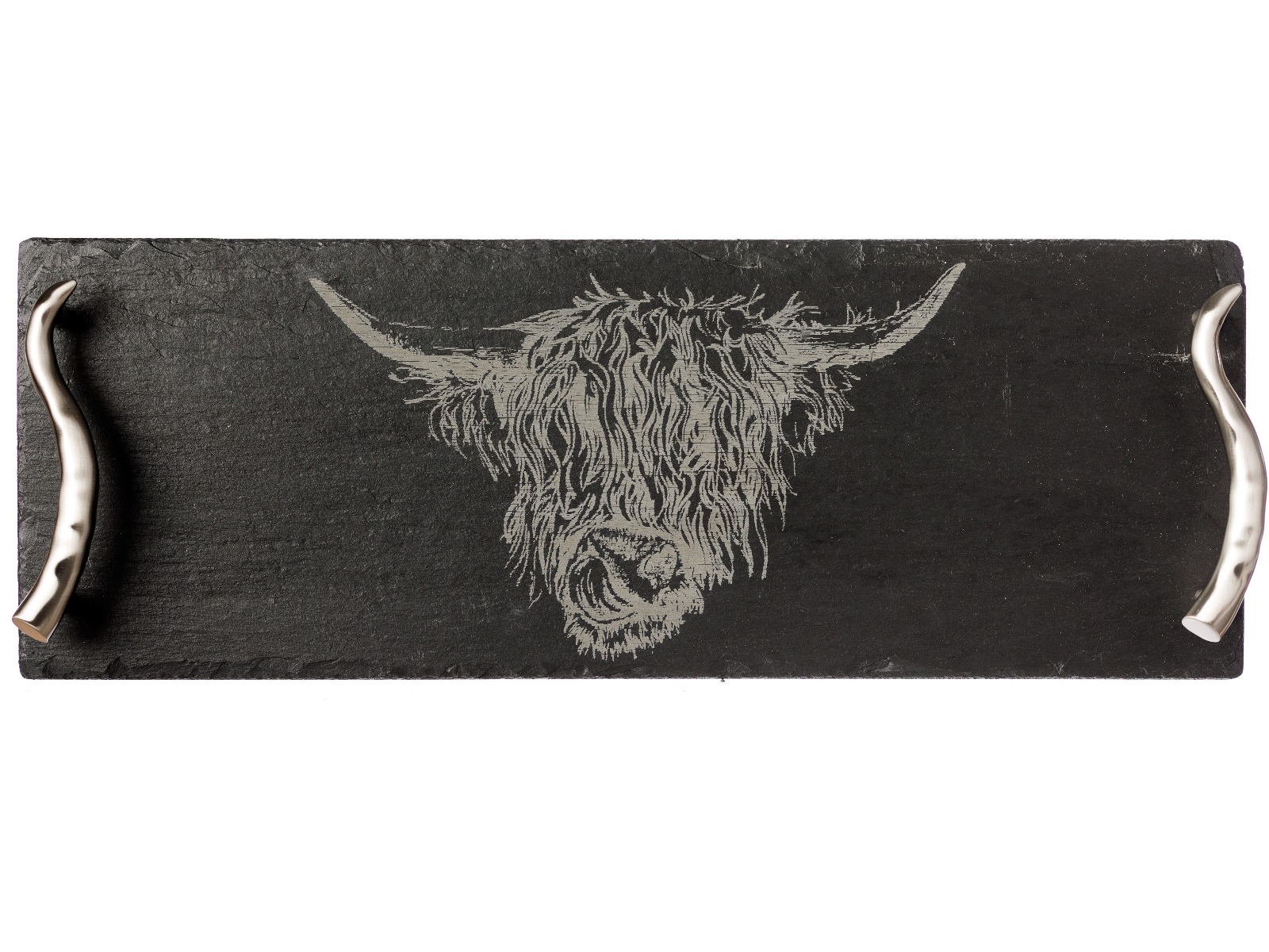 Geschmackvolle Highlights, wie die hornförmigen Griffe aus Edelstahl, bilden einen schönen Kontrast zu dem dunklen Schiefer und ergänzen die Gravur perfekt. Die Gravur selbst: Das Motiv Highland Cow | das Schottische Hochlandrind - die älteste, registrierte Viehrasse - und eines der beliebtesten schottischen Tiermotive.