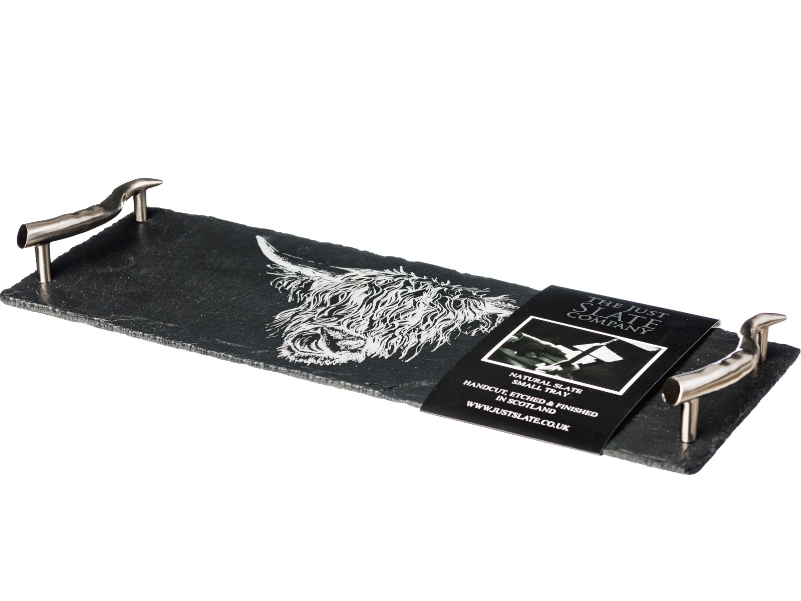 Stilvolles Serviertablett mit eingraviertem Motiv Hochlandrind - leicht skurril - handillustriert und -graviert in Schottland