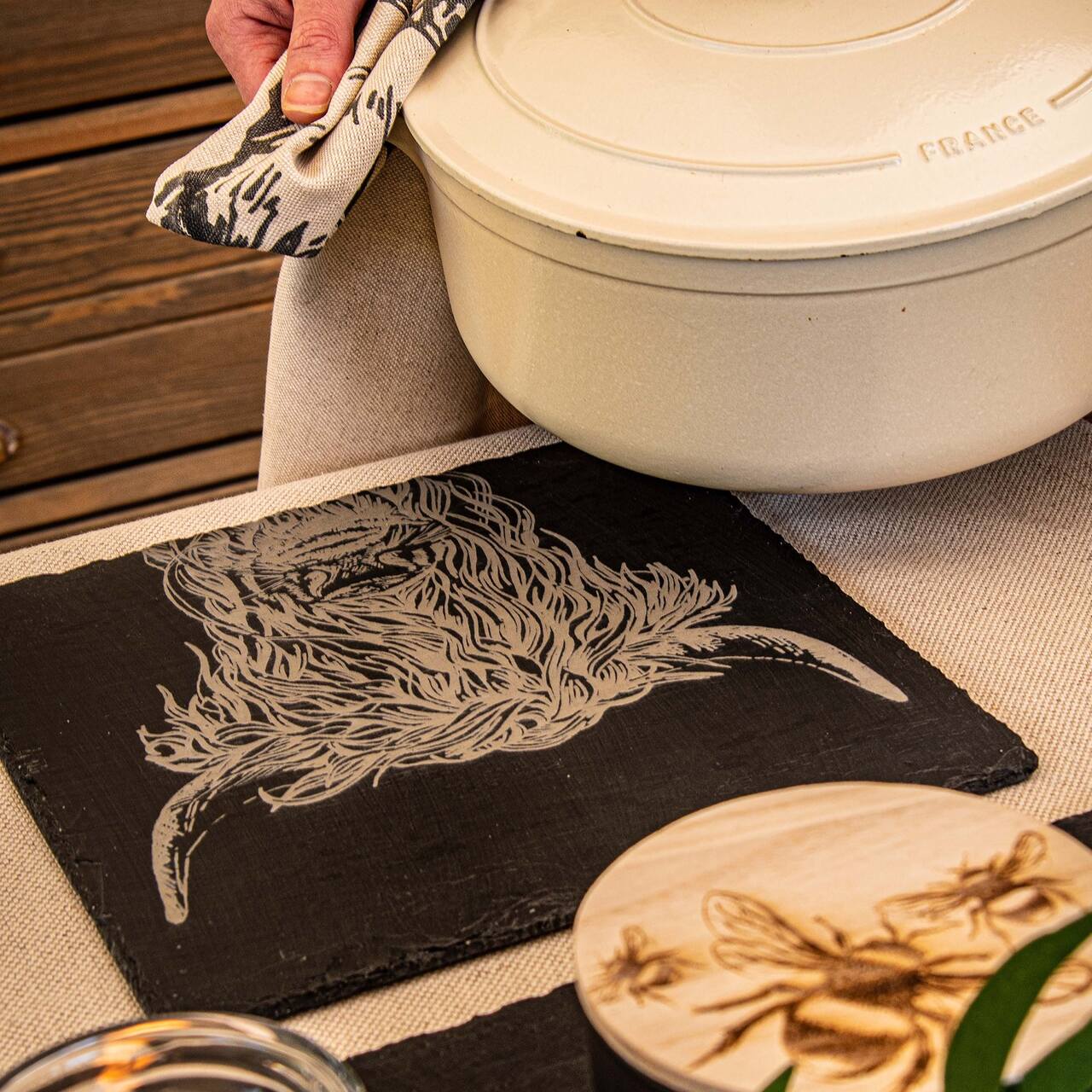 Country-Idylle für den Tisch | Mit eingravierter Highland Cow |  Wuschelig handillustriert und -graviert in Schottland