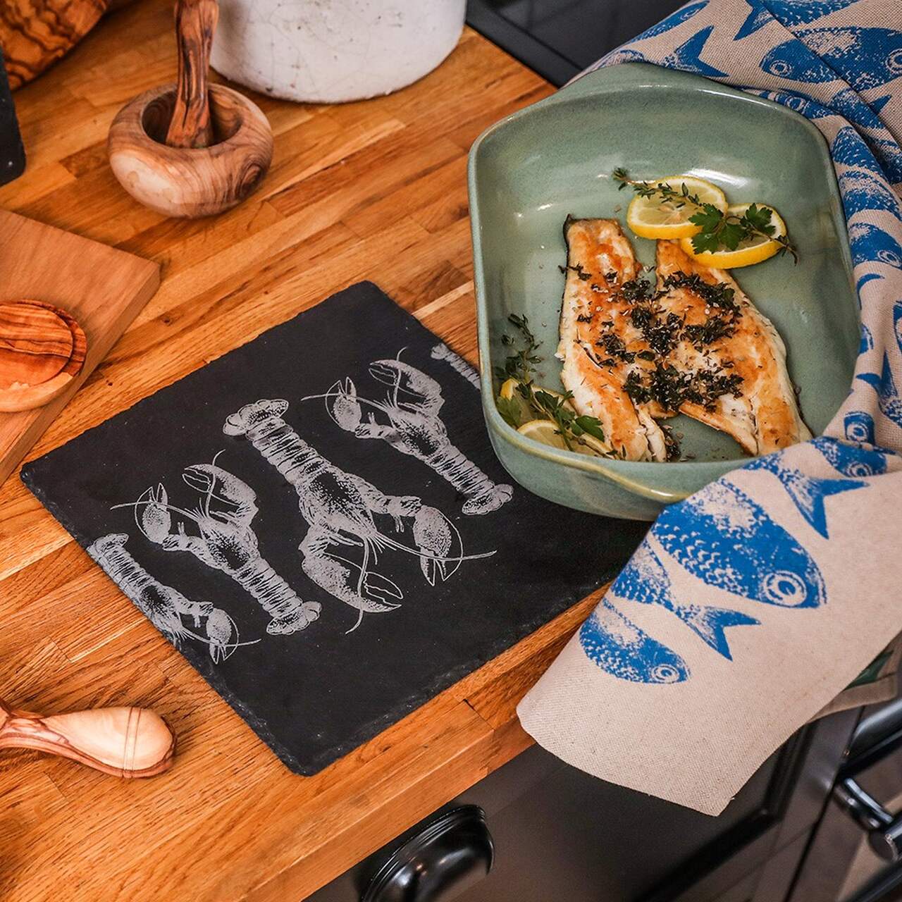 Die dekorativen Hummer und die robuste Langlebigkeit des Schiefers machen die praktischen Topfuntersetzer schnell zu einem Lieblings-Accessoire und zu einer Bereicherung für Küche und Tisch - wobei möglicherweise die Tatsache, dass die charakteristische Textur und die subtilen Farbvariationen des Schiefers jeden der Untersetzer zu einem Unikat machen, ebenfalls eine Rolle spielen könnte.