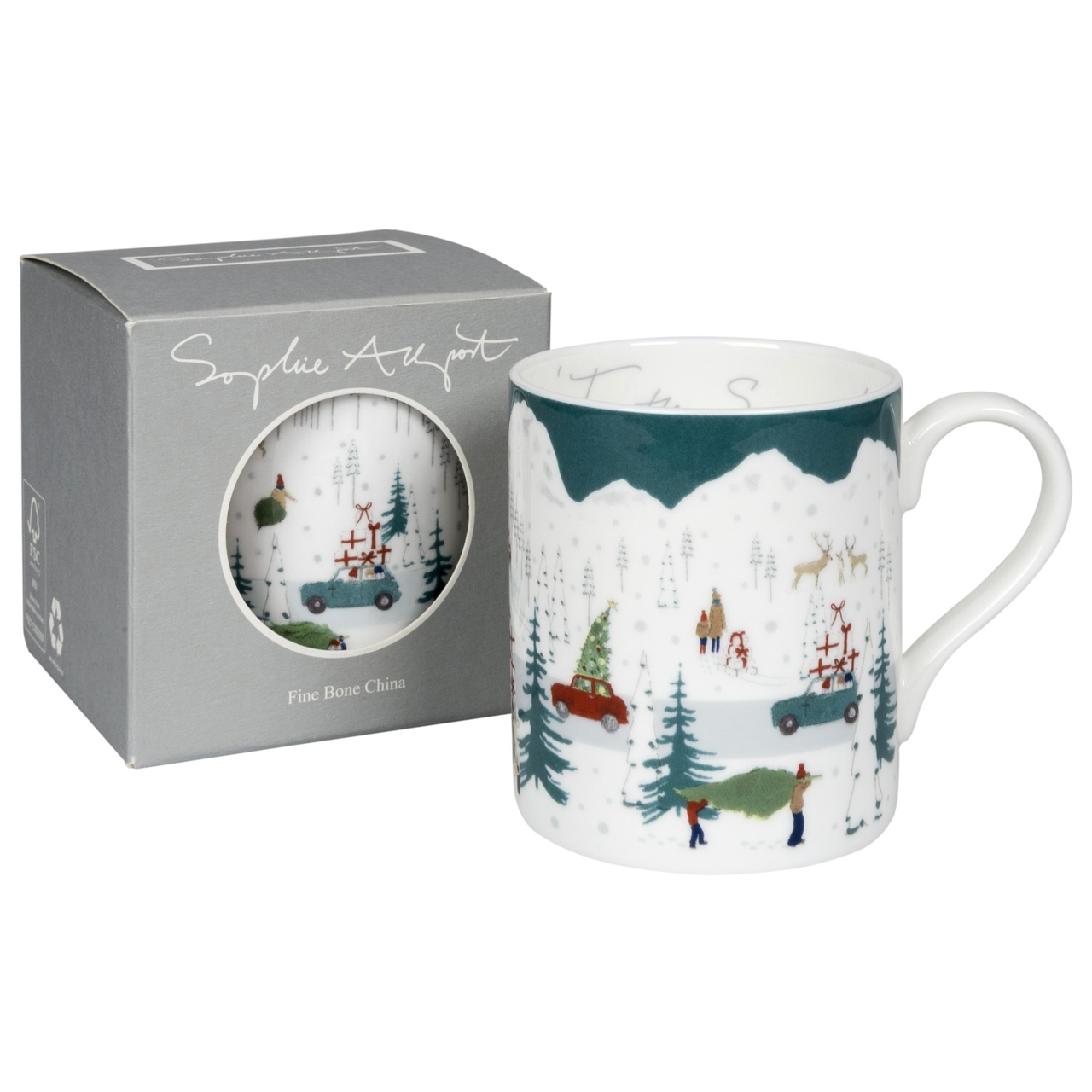 Das Design: Handgezeichnete Illustrationen von Sophie Allport mit einem Winterwald und verschneiten Bergen im Hintergrund, mit  Autos - voll beladen mit Tannen oder Geschenkestapeln, mit Spaziergängern im Wald und letzten Vorbereitungen für die Festlichkeiten. 'Tis the Season!' ist in Sophies Handschrift an den inneren Rand der Tasse geschrieben.