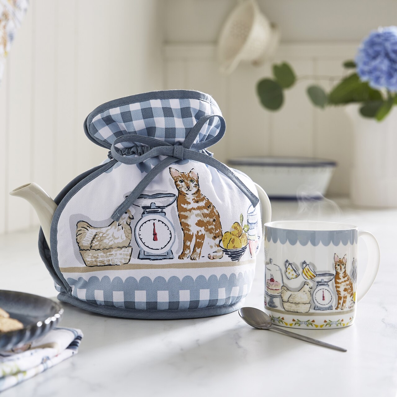 Die Intention: Ein gemütliches Küchenleben auf dem Land zu zeigen, mit Vorratsraum und Regalen, die vollgestellt sind mit Kochutensilien, Vorratsdosen, Schüsseln und Krügen, mit Zwiebeln, Kartoffeln und diversen Tüten, bis hin zu Kräutertöpfchen. Dass sich dahinein ab und zu ein neugieriges Hauskätzchen verirrt oder von verlockenden Düften angezogen wird, ist unvermeidlich. Das mit Aquarellfarben und Stift handgemalte Motiv spielt mit dem verschmitzten Naturell von Katzen, die sich auf Samtpfoten durch vollgestopfte Regale schlängeln. Landhaus-Karos und Blumenbordüren ergänzen den reizenden Cottage-Charme.